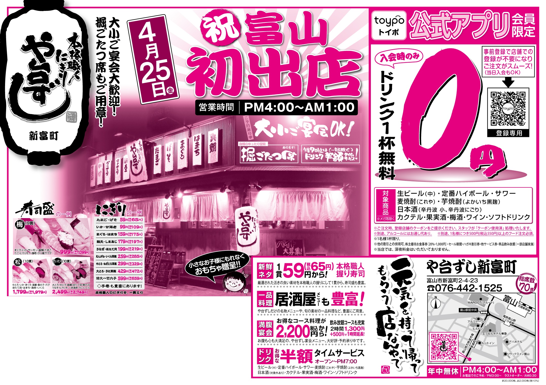 4月25日(金) 富山県富山市「や台ずし新富町」オープン!!