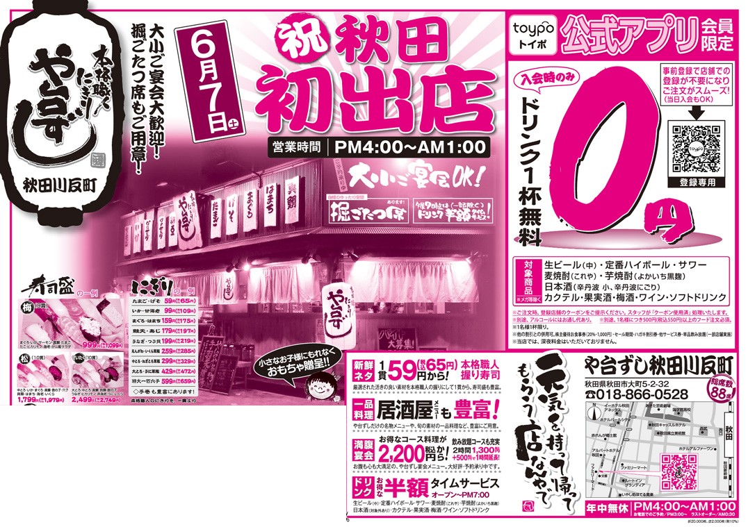 【オープン】や台ずし秋田川反町6月7日(土)~ -