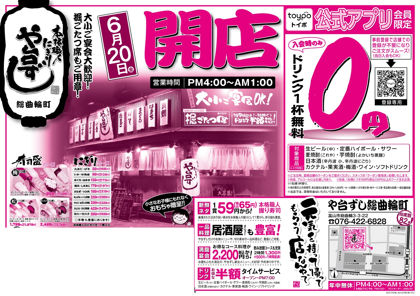 【オープン】や台ずし総曲輪町6月20日(金)~ -