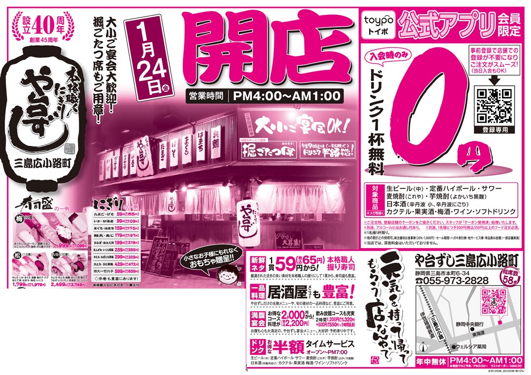 【オープン】や台ずし三島広小路町1月24日(金)~ -