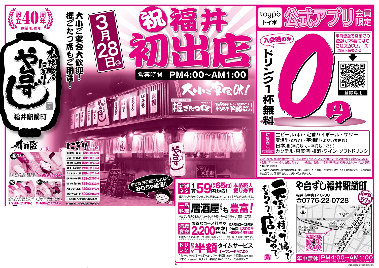 【オープン】や台ずし福井駅前町3月28日(金)~ -