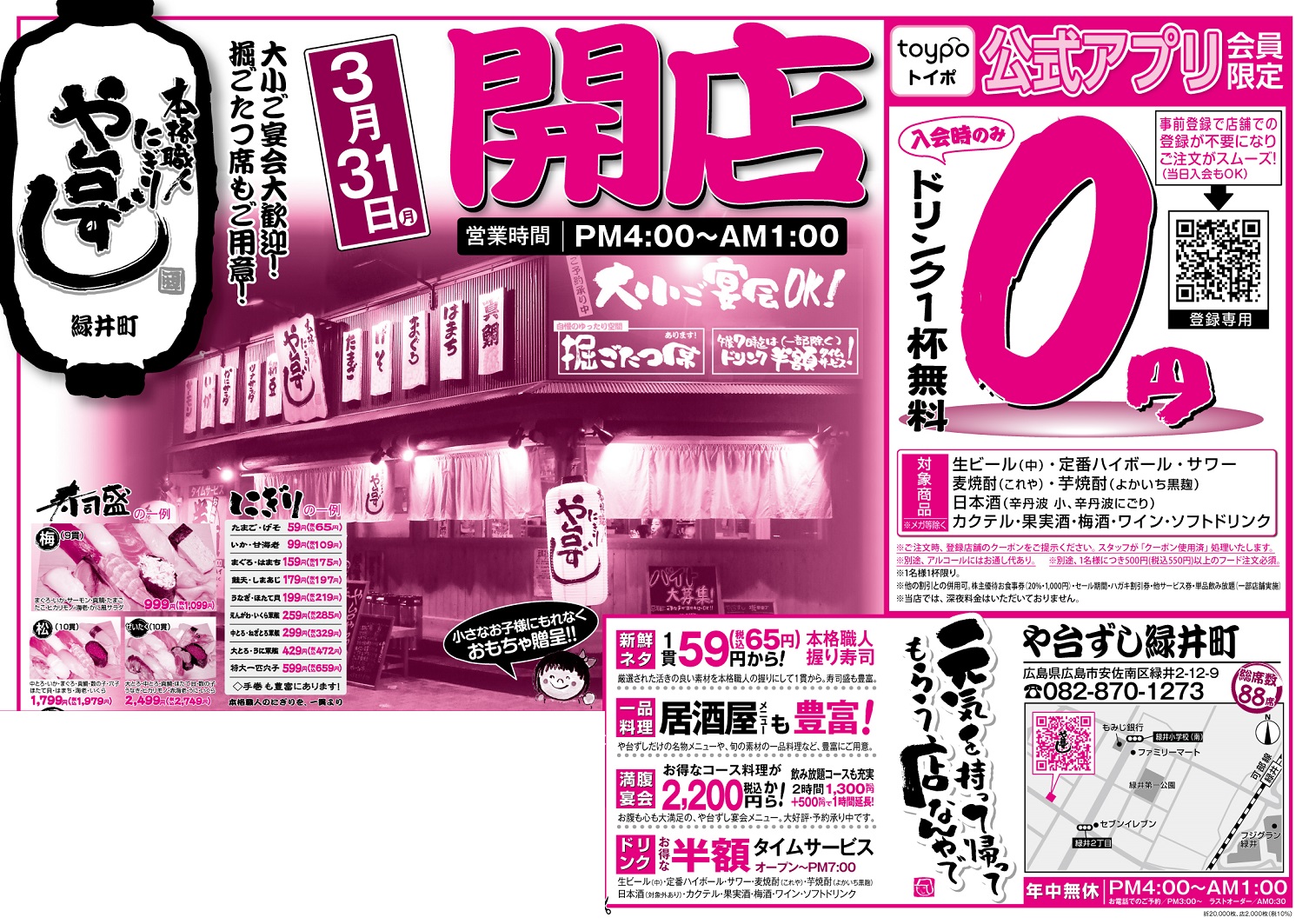 【オープン】や台ずし緑井町3月31日(月)~ -