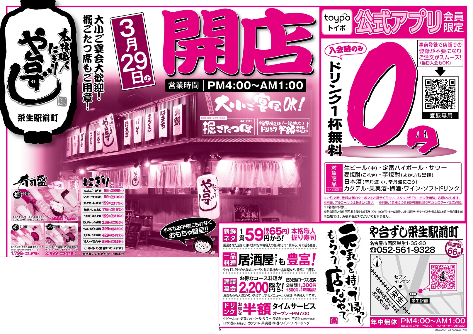 3月29日(土) 愛知県名古屋市「や台ずし栄生駅前町」オープン!! -