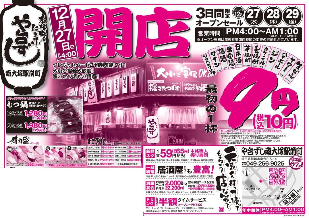 【オープンセール】や台ずし南大塚駅前町12月27日(水)~ -
