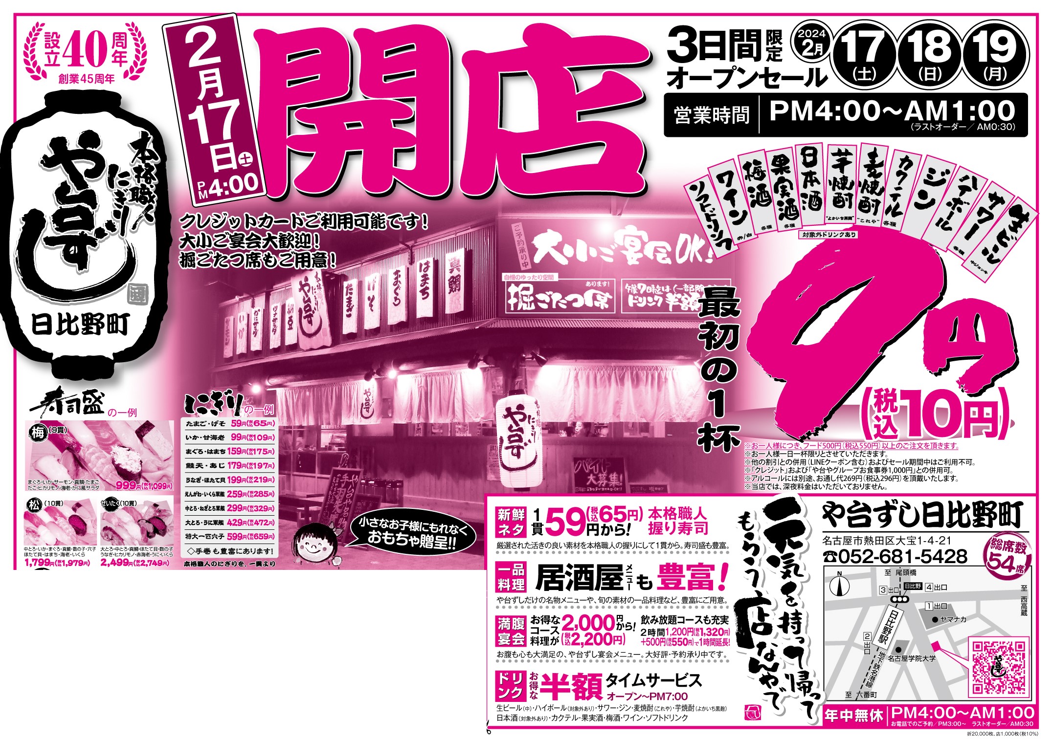 【オープンセール】や台ずし日比野町2月17日(土)~ -