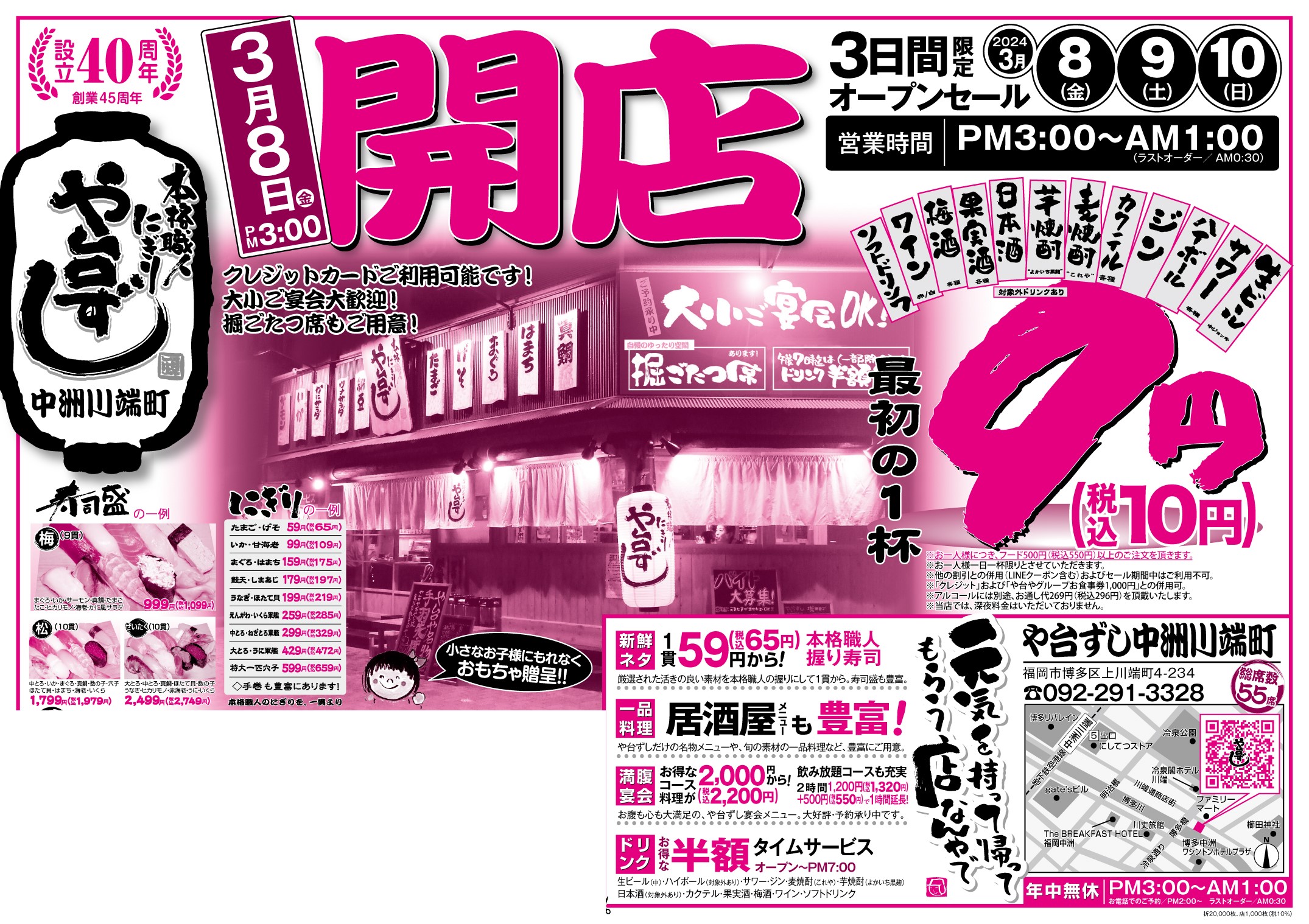 【オープンセール】や台ずし中洲川端町3月8日(金)~ -